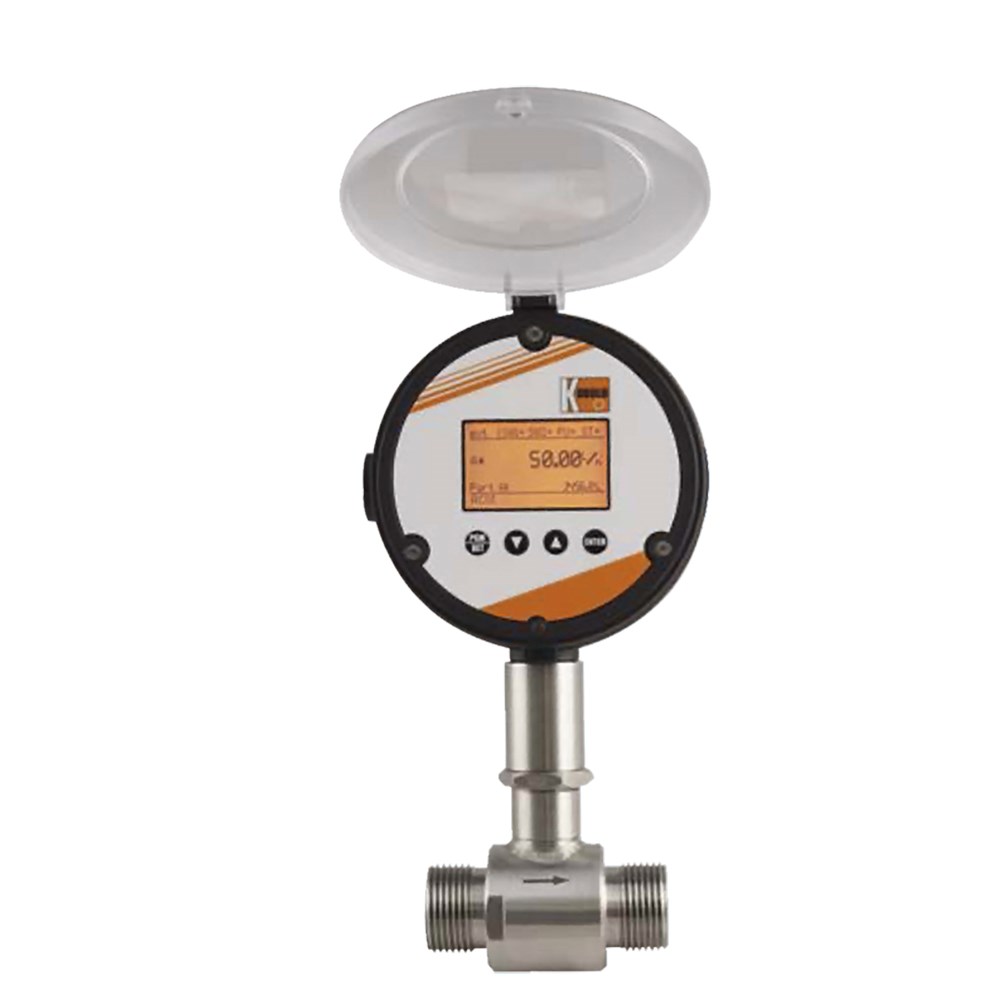 The turbine flowmeter model DOT consists of a helically shaped turbine rotor supported in two tungsten carbide bearings, the rotor being solid ferritic stainless steel of a grade compatible with the metered liquid, all contained within a housing of non-magnetic stainless steel. A pick off coil having a permanent magnet core is mounted in the housing adjacent to the rotor blade tips such that a magnetic circuit is set up via the rotor blades.